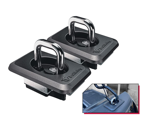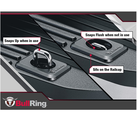 Sidewall mount Bull Rings mount just below the truck rail. Rated at 1,000 lbs., the bullet lifts up and out at a 35° angle to match the angle used when securing loads with ratchets or rope.